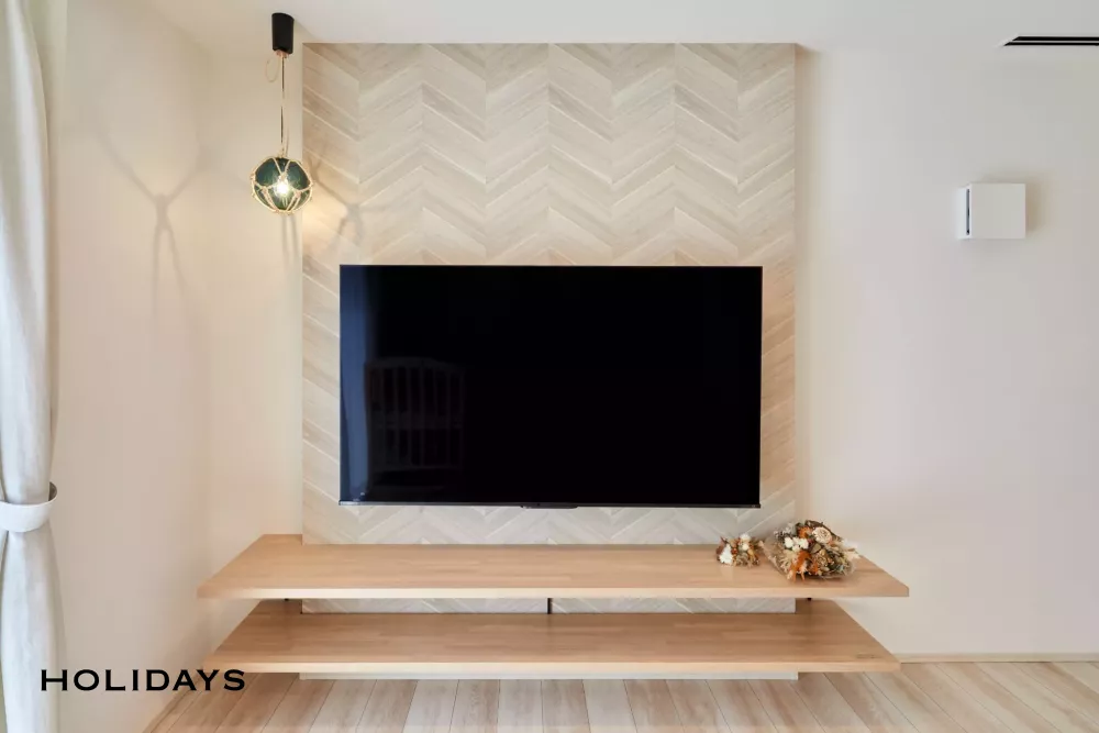 TV面の壁を一部前に出し、その壁にフレンチヘリンボーン柄のクロスを採用。このひと工夫でおしゃれな空間を創り出すことができる。TVカウンターにはオープン棚を2段設置。収納且つ飾り棚としても活用できる、便利なカウンターになった。さらにTV面のアクセントとして、麻縄で吊られたブルーガラスのペンダントライトを設え、サーファーズ空間をより引き立ててくれている。
