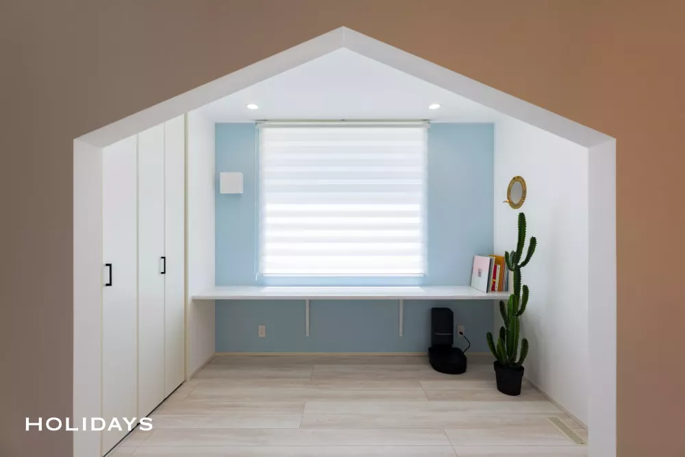 ワークスペースとして活用できる部屋をキッチンの前に計画。建具をなくし、キッチンと山型垂れ壁で仕切られたこの空間は、LDKとの繋がりを感じながらも、プライベートスペースとしても使うことができる。