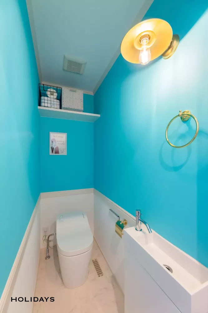 天井と壁に施したモールディングに鮮やかなブルーのクロスを組み合わせ、お施主様こだわりのトイレに仕上げた。ゴールドの照明器具がとても映え、サーファーズハウスらしい空間になっている。