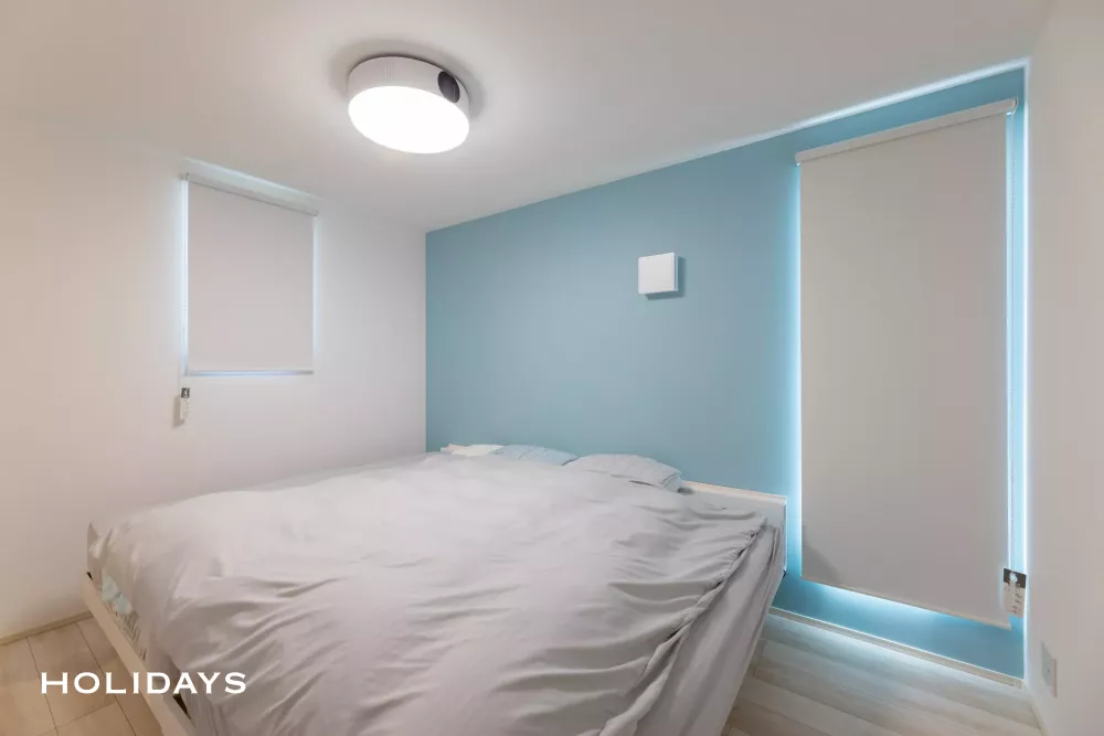 寝室のアクセントクロスはブルーの中でも少しくすんだ色合いを選定。爽やかさを残しつつ寝室らしい落ち着いた印象に仕上げた。
