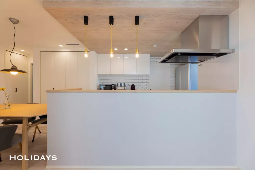 カップボードのワークトップとキッチンの笠木を同柄にすることで、統一感が生まれている。ゴールドのペンダントライトを多灯吊りし、おしゃれ度をさらにプラスした。
