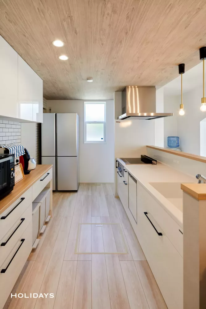 折下げ天井にはリアルな表情が特徴の木目クロス、キッチン背面壁には白を基調としたタイル風クロスを採用。とても爽やかで明るい印象のキッチンに仕上がった。