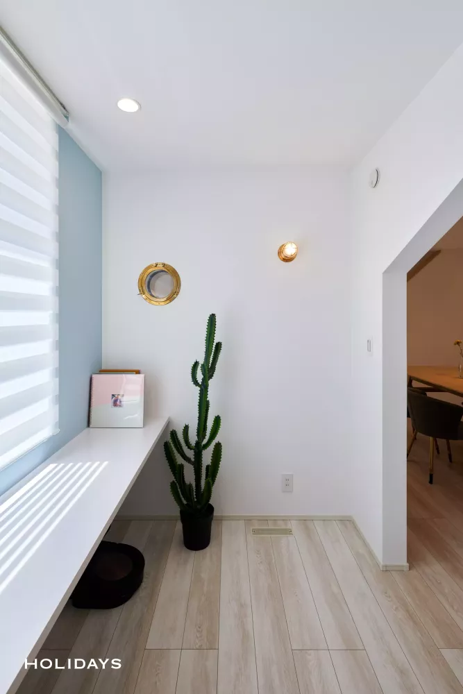 ホワイトをベースにした、明るく爽やかな印象のサーファーズハウスになりました。ブルーのアクセントクロスが一層サーファーズらしさをプラスしています。また、デザインだけでなく収納も重視。シューズインクローゼットやパントリーをはじめ、十分な収納スペースを確保することでスッキリとしたお住まいをキープすることができます。さらに、全館空調も搭載されているため、一年を通して家中どこにいても快適な温度で生活することができます。