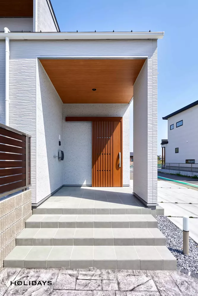 玄関先には大理石調のアクセント外壁と木目の軒天、縦格子の玄関ドアを組み合わせて、上品な重厚感を感じるアプローチに。