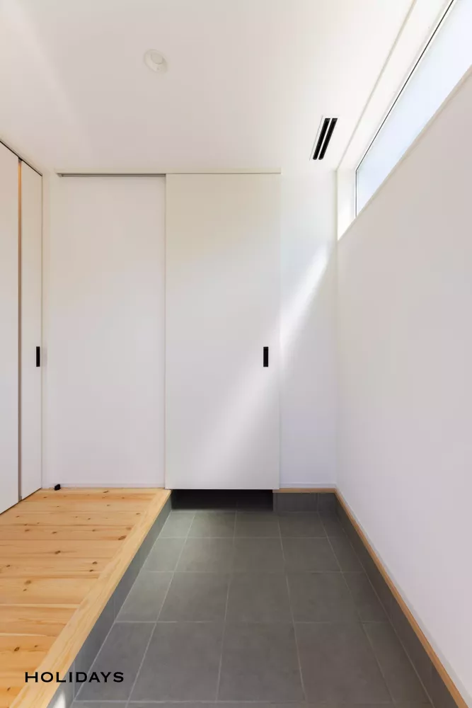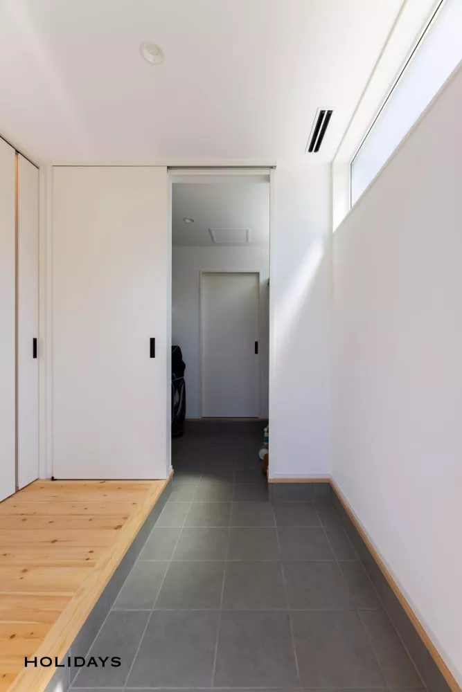 ドアを開けると、クロスと色味を合わせたハイドアの建具で、ミニマルでスッキリとしたホールが出迎えてくれる。高窓からの日射しも入り、明るく清潔感のある空間となった。