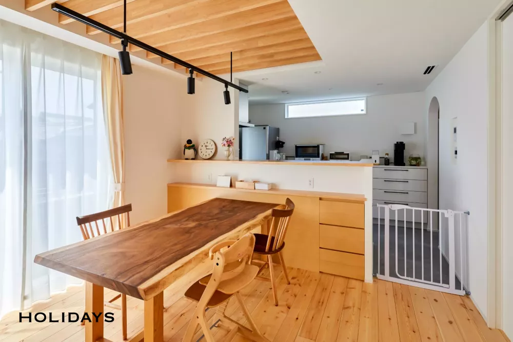 床材や天井ルーパーだけでなく、ヌックやダイニングまで木目を使用することで、木の温かみを感じるLDKに仕上げました。またお家の回遊動線にこだわることで、生活動線がスムーズになるのはもちろん、毎日の家事ラクを叶えます。
