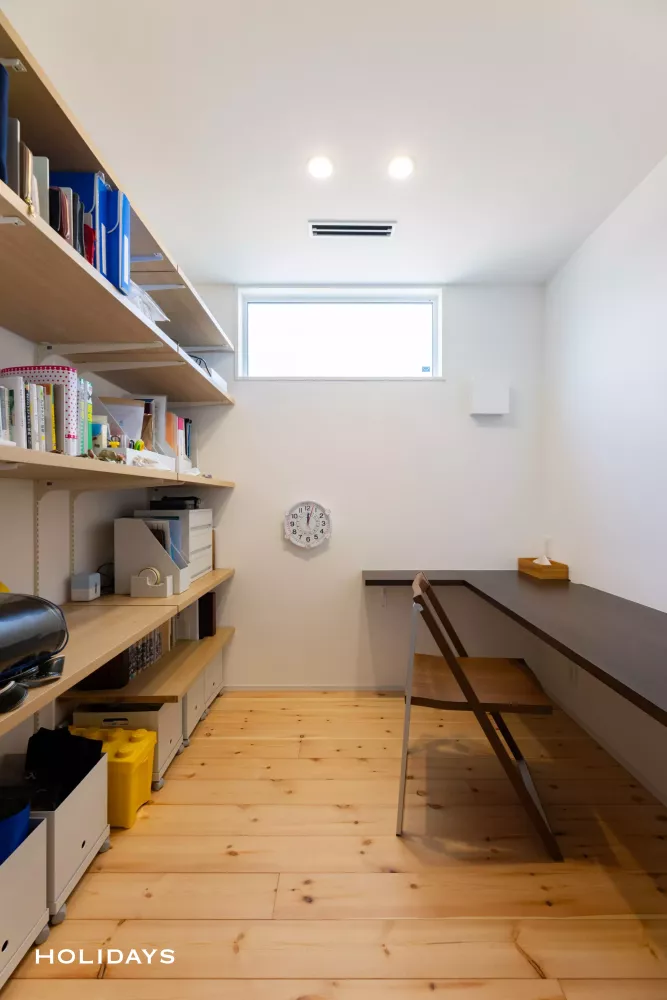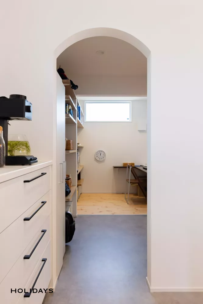 キッチンの奥には食事の準備がラクになるパントリー、さらに奥にはご家族で使える広々としたワークスペースを設計。