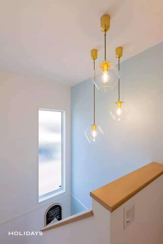 お気に入りのペンダントライトを吊り下げ、一面に淡いブルーのアクセントクロスを貼ることで、通ることが楽しくなる階段に。