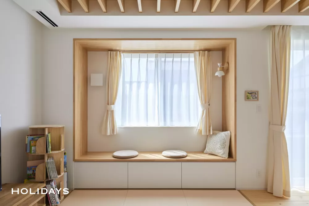 リビング横の窓には座ってくつろげるヌックを設けた。その時の気分で過ごし方を自由に変えられる空間となっている。ヌックの下は造作の収納になっており、リビング周りの小物が収納可能。