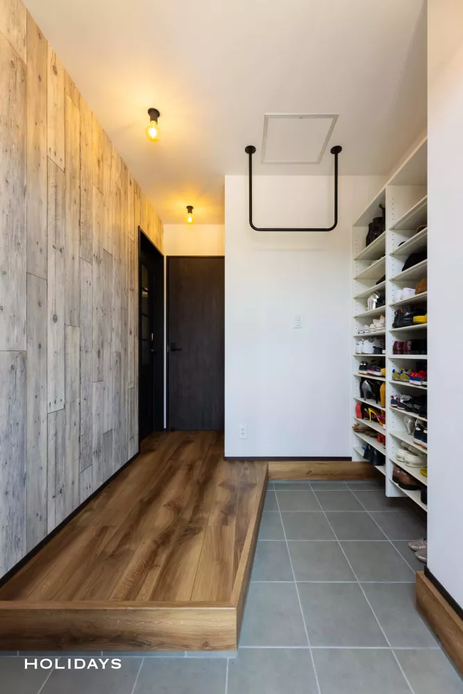 畳数以上に広く感じられるような工夫がされた玄関。3帖ほどの広さだが、奥行きを感じられるような玄関框のデザインや、建具の色味もブラックを使用している。また、縦方向も広さを感じられるよう、縦貼りした木目のアクセントクロスを採用し、照明にもデザインを付けることで自然と目線が上に行くように空間に工夫を施した。