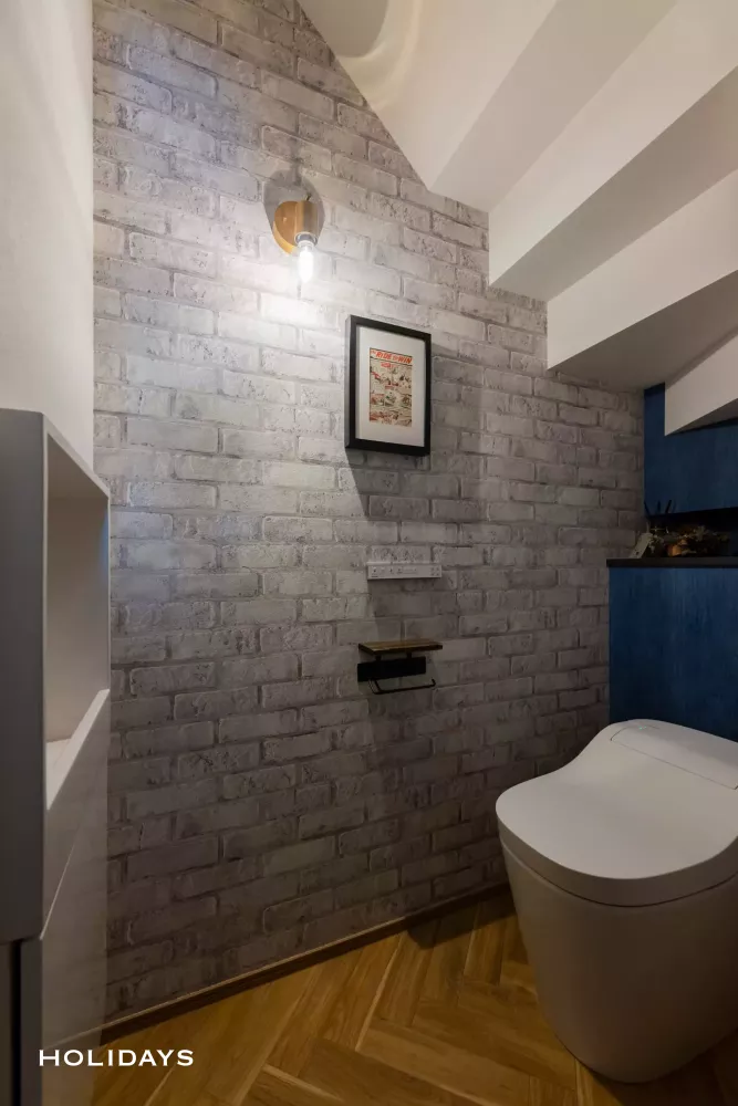 階段下に設けたトイレには、段々のデザインを活かした色使いにこだわっている。広さを感じられるように、天井部分と座った際の正面の壁面は膨張色のホワイトを採用し、奥まった部分には奥行き感を感じられるようダークトーンでまとめた。また意匠性も感じられるよう、入った正面にはレンガ調のタイルを採用し、柄を目立たせるために彩度は落としている。そこに広がるブラケット照明の光がよりテイストの味を醸し出してくれている。