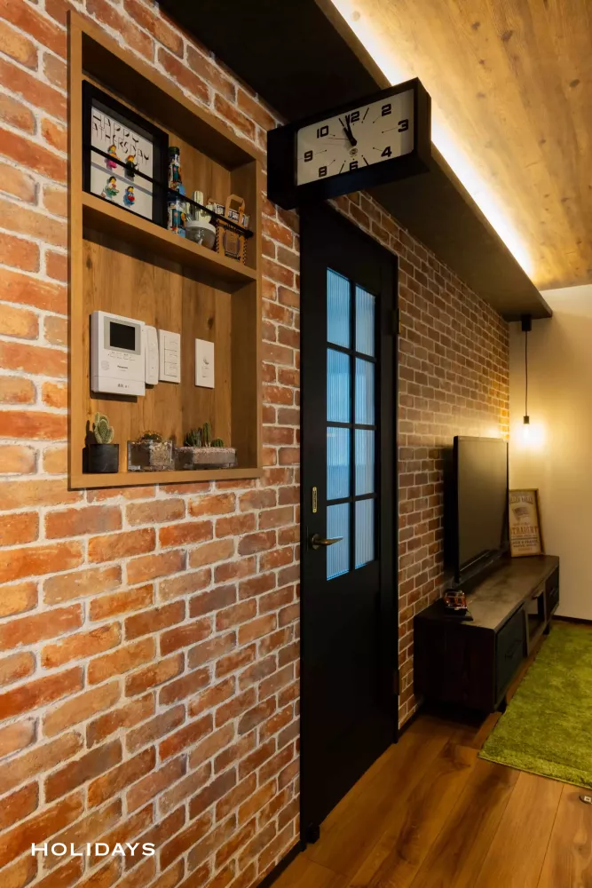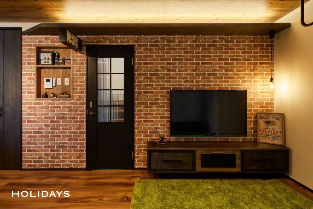 リビングドアにもデザインをプラス。全体的なデザインがごちゃつかないよう、お部屋全体の建具の色味を控えめに演出し、レンガ調のアクセントクロスが主役の空間になるような照明計画と色使いを施している。旦那様がDIYされたテレビボードがよりインテリアとしても際立ち、テイストにもマッチしている。