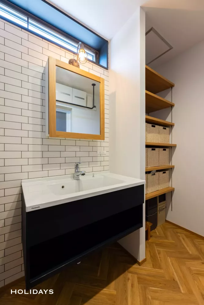 洗面室は明るさを感じられるように、レンガ調クロスもホワイトのものを採用。木の色合いもワントーン明るめで設えることで、テイストはそのままでもよりフレッシュで清潔感のある空間になっている。木枠のミラーは意匠性が演出できるためシンプルな洗面でもデザイン性をプラスすることが可能。