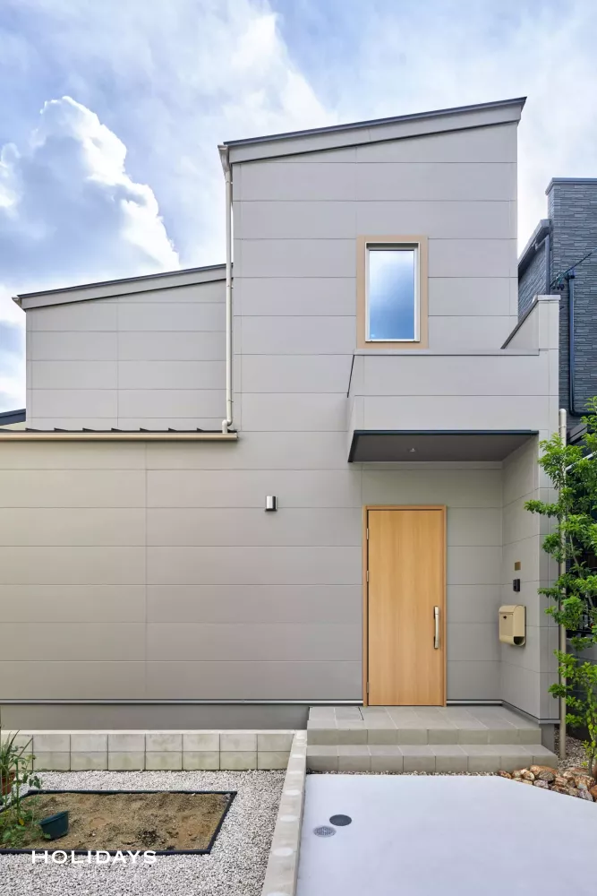 グレージュのフラット外壁をメインに、ライトブラウンの玄関ドアと窓モールをアクセントに設えたナチュラルモダンな外観に仕上げた。