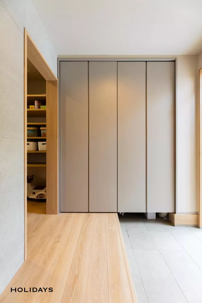 玄関ホールには、家族分の靴やベビーカーなどを収納するのに十分なスペースを確保。ごちゃごちゃしやすい玄関収納も建具を設置することでスッキリ見せることができる。