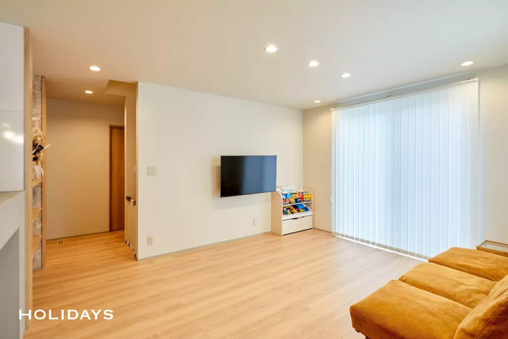 全館空調を搭載した、室温が一定の快適なお家では、玄関ホールとリビング間の扉をなくすことができ、閉鎖感がゼロの開放的なリビングが実現できる。