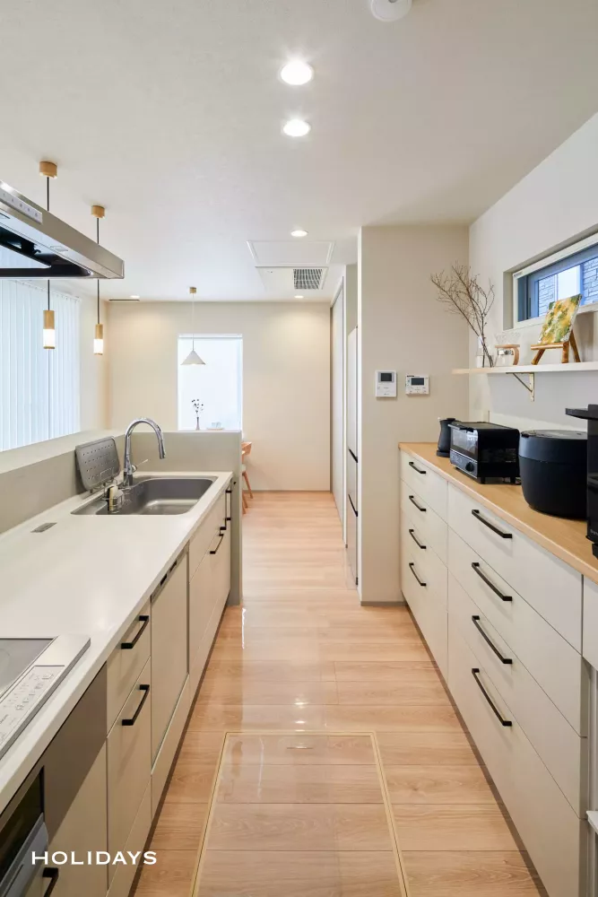 グレージュ×あたたかみのあるライトブラウンを基調として、素敵な“ナチュラルモダン”のお家に仕上げた。全館空調を搭載したお家だからこそ実現できる、建具を可能な限りなくした、開放的な間取りがとても魅力的。魅せる収納や異素材の組み合わせなど、お施主様のこだわりやセンスを感じる、美しい設えとなった。