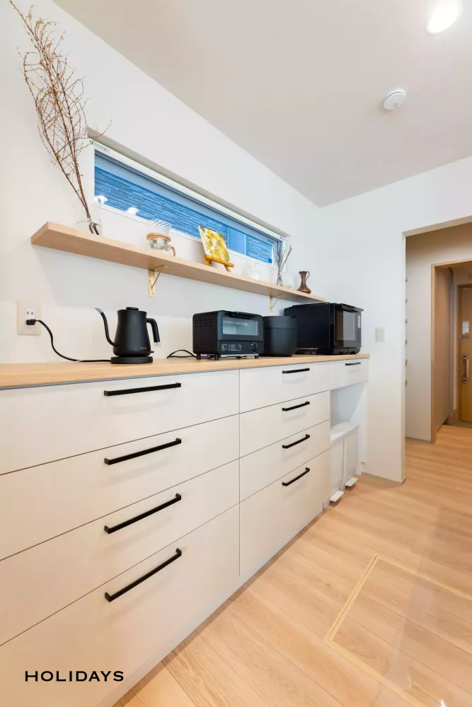 収納力抜群のカップボードには、置き場に困りがちなゴミ箱の収納スペースも計画。さらにカップボード上に飾り棚を設置し、カフェのようなおしゃれ空間を造り上げた。