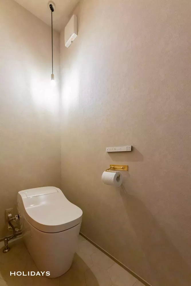 全面をベージュで統一した、落ち着いた雰囲気の洗練されたトイレスペース。ゴールドのトイレットペーパーホルダーがアクセントになっている。