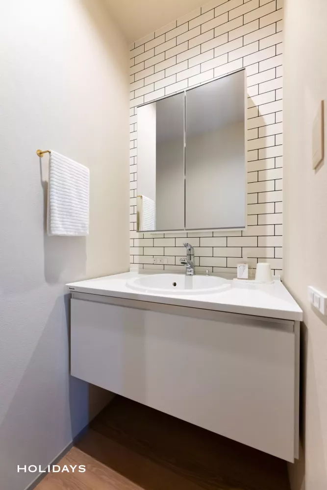 ホワイトカラーをベースにした空間はレンガ調のアクセントクロスが良く映え、シンプルの中に清潔感を感じさせる洗面。