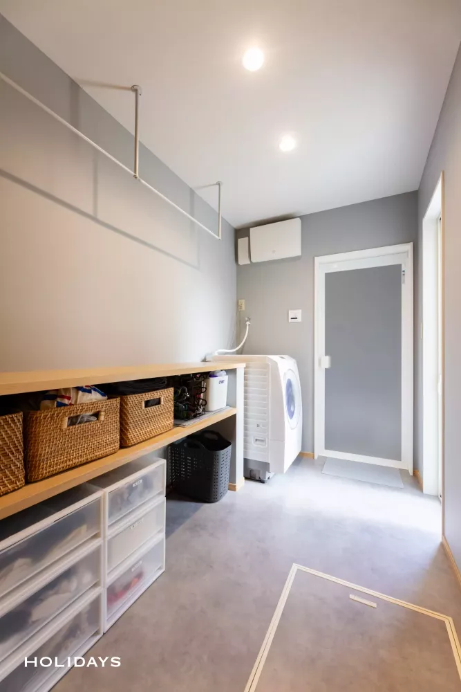 グレーとベージュを組み合わせた明るい印象のランドリールームには、作業カウンター・造作収納棚・ハンガーパイプを計画。洗濯関連の家事を1つのスペースで完結できる神空間に仕上がった。