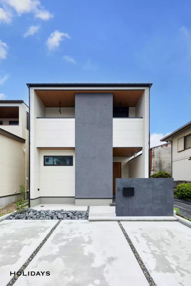 ホワイト・グレー・ブラックでまとめた外観。スタイリッシュさの中にも温かみを感じれらるよう、軒の色を木目とし、さりげないアクセントになっている。門壁は、より奥行き感と空間のメリハリ感を演出するために濃い色味を採用。色使いと外観のボックス型も相まって、少しモダンな印象な外観となった。