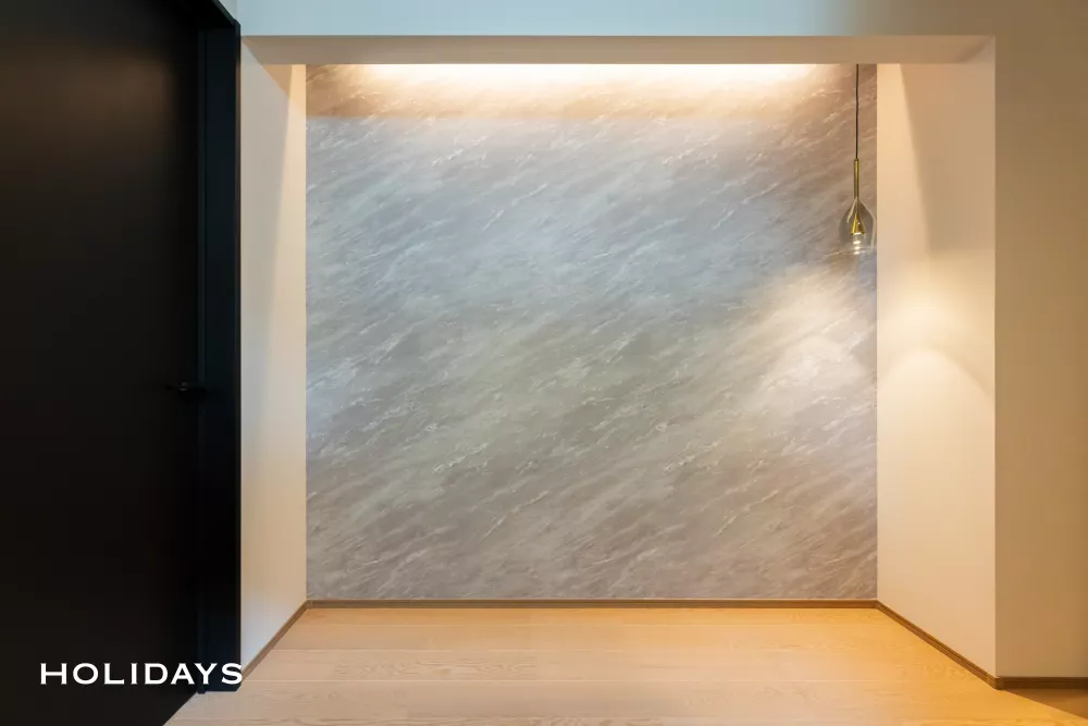 玄関ホールは、ホテルのラウンジをイメージしたデザインに。間接照明とデザイン性のあるペンダントライトで、意匠性をアップさせるだけでなく、器具の根本を隠すことで、より天井の高さも感じられるようにした。ご家族やご友人をお家に招いた際に、素敵な印象を持たせることができる玄関廻りへと仕上げることができた。