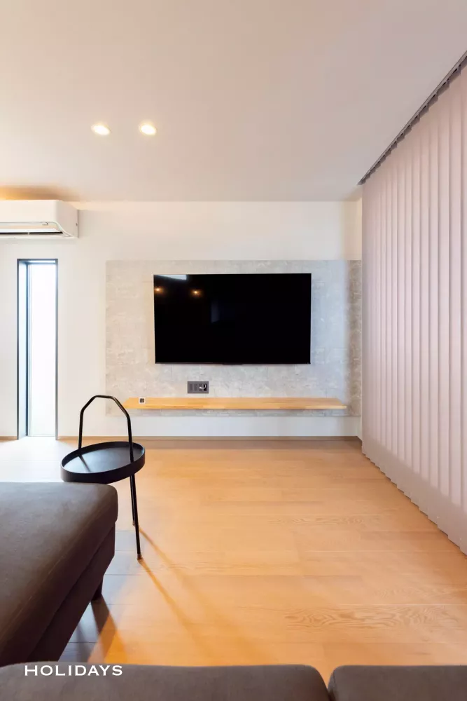 リビングの主役のテレビボード。アクセントウォールを設けて、空間に馴染みつつも、しっかりと意匠性を高めており、石目調のクロスと木目の相性も抜群。