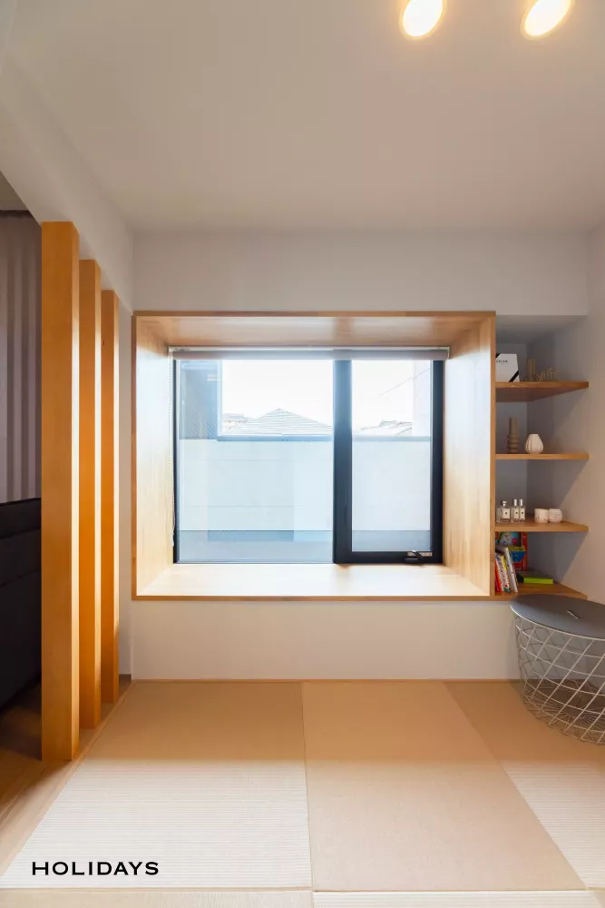 リビングの一角に設けたタタミスペースには、サッシと合わせた造作ベンチを設計。タタミ色もデザインの邪魔をしないように、LDKの雰囲気に合う色を選定している。木の格子とタタミで、日本ならではの居心地の良さを感じられつつも、現代韓国風テイストに馴染むそんな美空間になった。お子様のお昼寝や休憩タイムにも活用できるスペースにはしっかりと収納棚も完備し、使いやすさにも配慮したデザインに仕上げている。