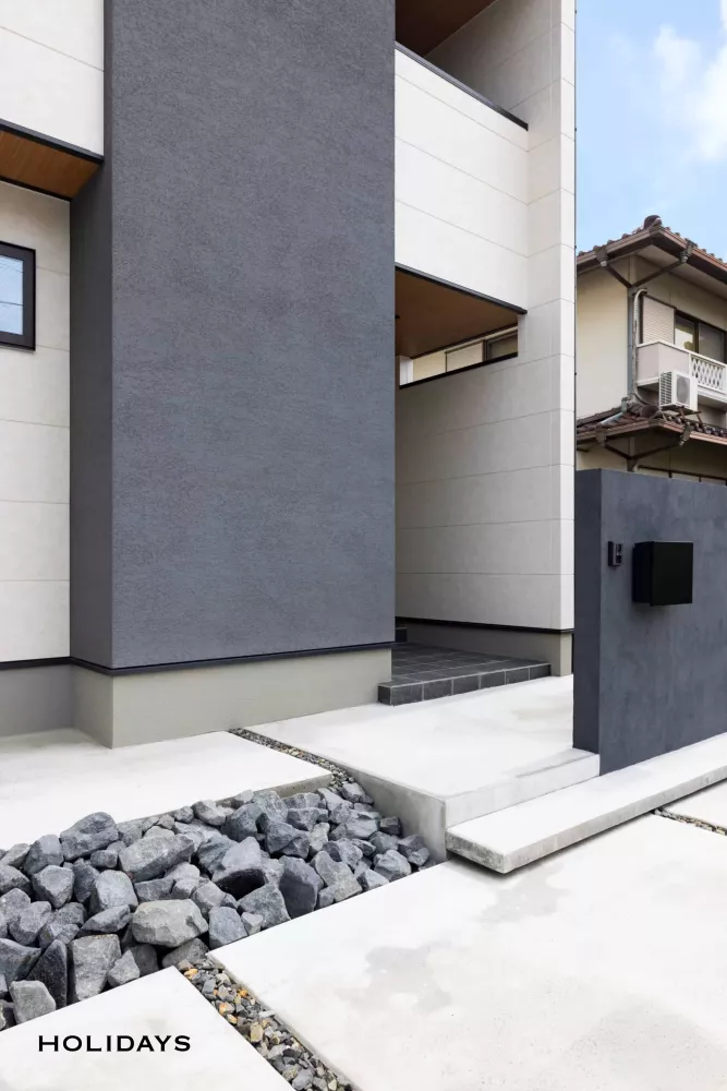 軒天と外壁材を合わせることで、建物のデザインをより際立たせ、また色合いがぼやけないようにブラック色で空間を引き締めた。アプローチのステップはスタイリッシュさを演出するために、蹴込を浮遊感のあるデザインにしている。