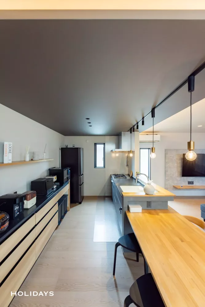 LDKの統一されたデザインに馴染みつつも「キッチン」として、よりデザイン性を持たせた空間となった。下がり天井にはあえてダークトーンを採用し、空間に締まりを持たせている。また下がり天井を支えるような位置に柱を設置し、キッチンの腰壁に差し込むようにダイニングテーブルを造作。様々な要素が掛け合わさって一つのデザインを演出している。