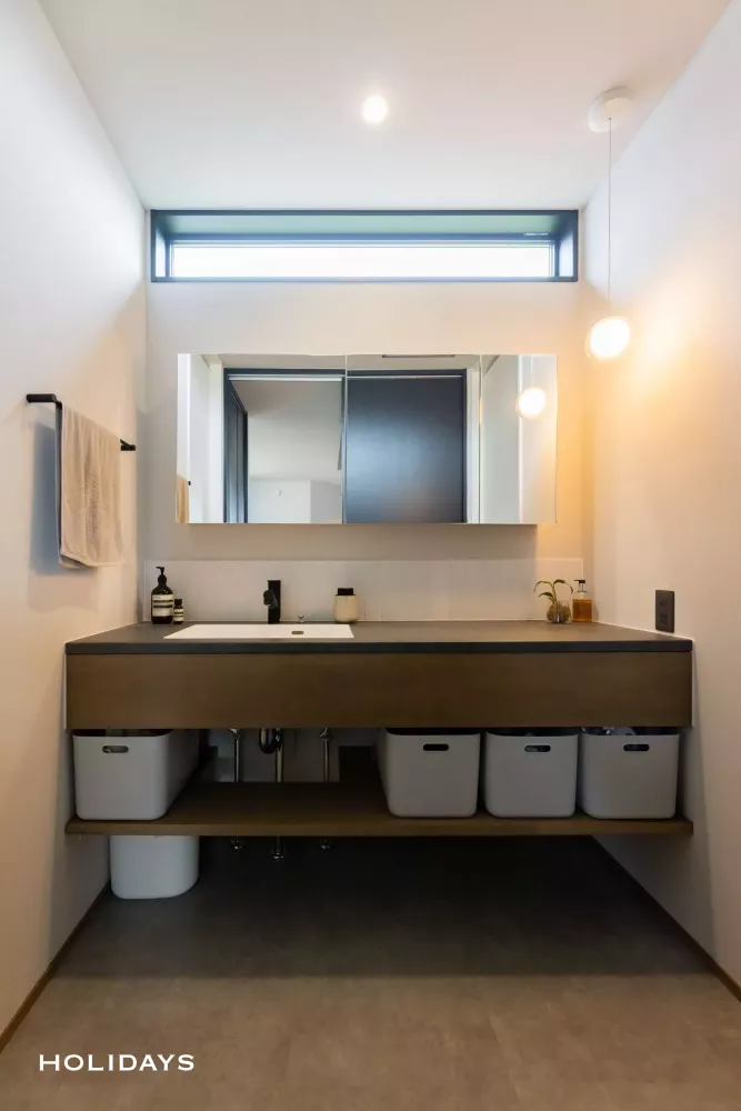 LDKの明るい印象とは反対に、ダークトーンで落ち着き感を感じられる洗面に。横幅約170cm程があるため、二人並んでも余裕で身支度が行える。洗面カウンターの立ち上がりにはタイルを設けて、水はねにも安心なつくりとなっている。タイルの存在を感じつつも主張しすぎないデザインをプラスし、空間に統一感を持たせた。また韓国テイストを感じさせるペンダントライトが空間のアクセントにもなっている。