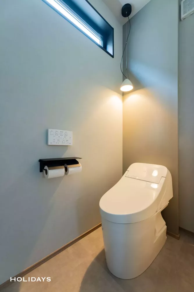 お客様も使用する2階のトイレ。こちらは背面に見えないよう掘り込みの収納を造作し、いつでもすっきりとした印象を持つことができる。奥に目線が行くようにペンダントライトを配置することで、陰影を楽しむデザインウォールとしても活躍するため、意匠性も感じられる一石二鳥のデザインができあがった。