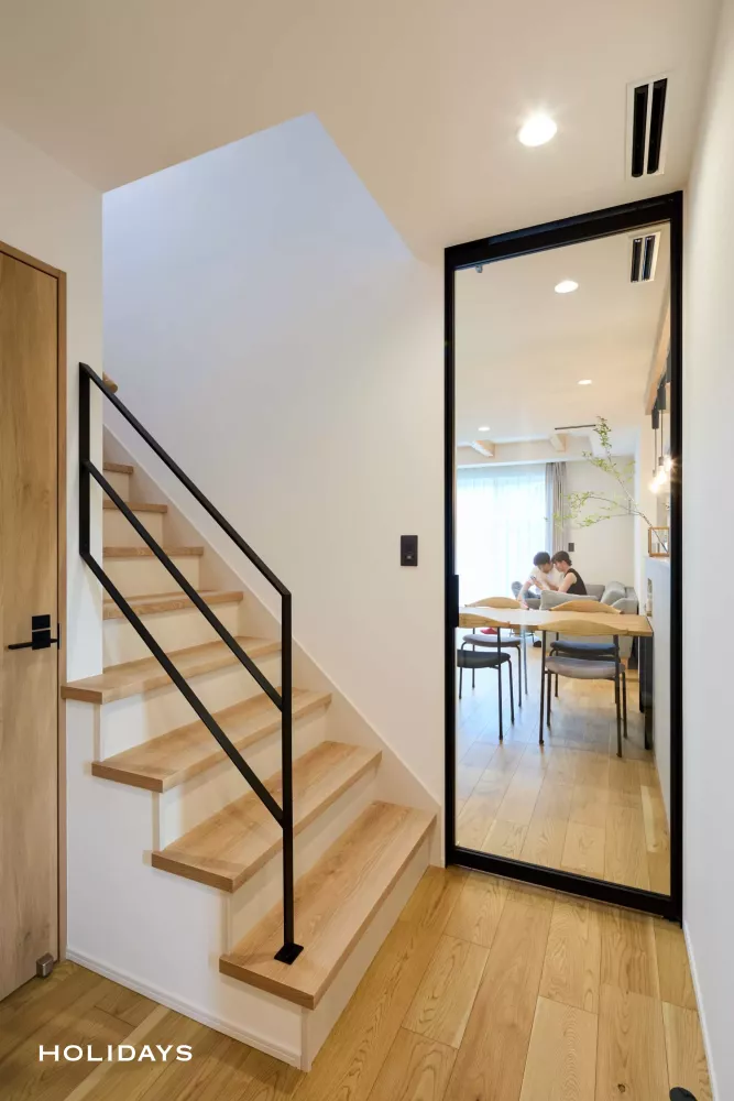 リビングドアにはガラスのハイドアと、アイアン手摺の階段で開放感のあるリビング動線になっている。