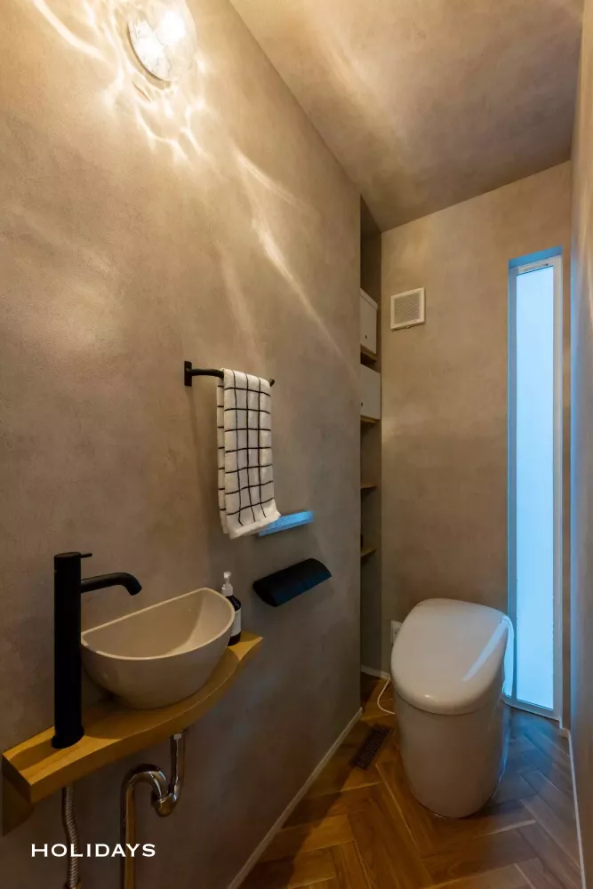 こだわりの造作手洗いを設置したトイレ。隣のFCLのデッドスペースとなりやすい部分をトイレ空間とし、大容量の収納を確保した。