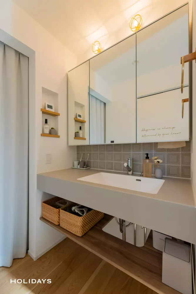 お気に入りのタイルを施工した洗面。ニッチや下台のオープンな収納と、三面鏡の扉付収納で隠したいものは隠しながら使い勝手のいい洗面スペースとしている。横にはFCLへ続く動線になっており、お客様がいらした際にはカーテンで間仕切ることができる。