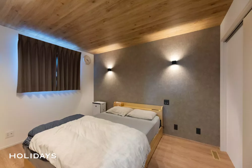 天井と枕元にアクセントクロスを用い、ゆったりくつろげる空間に。照明は調光タイプなのでシーンによって手元で調整できる。