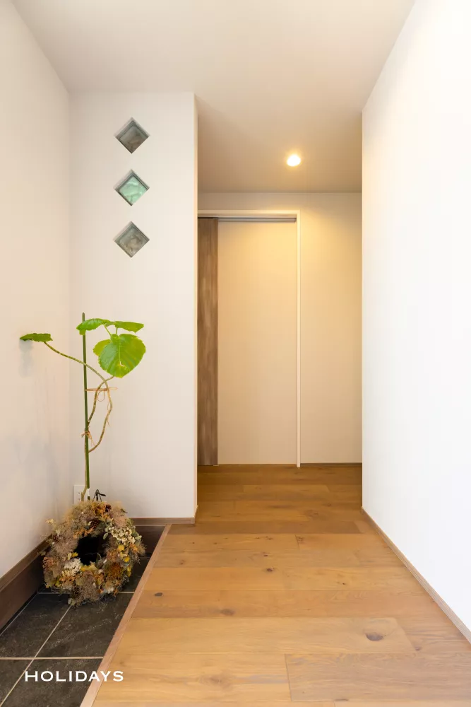 玄関ホールの壁にはめ込んだガラスブロックは、窓からの光や照明の灯りと相まって、ガラスならではの柔らかく美しい表情を映し出す。