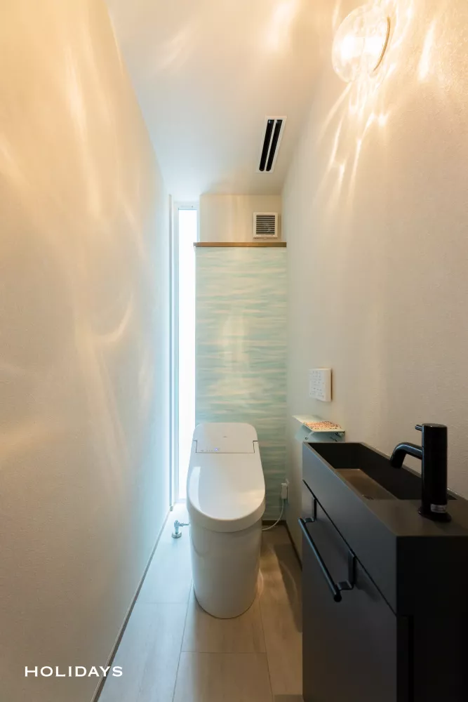 “水面(みなも)”を連想させる、爽やかで清潔感のあるトイレ空間に仕上がった。一見収納スペースがないように見えるが、袖壁の背面には収納棚を計画。隠したい掃除用品などをスッキリと収納することができる。