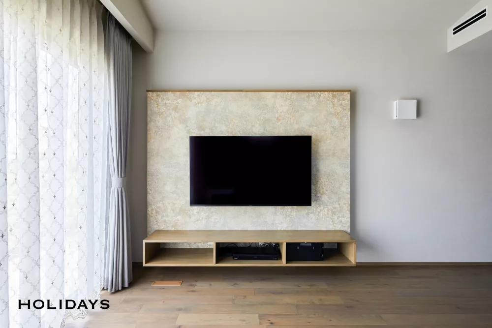 リビングのTV面は壁をふかし、ラスティックな石目を表現したクロスを採用した。TVボードはふかし壁にフロートにて造作。お施主様のこだわりが感じられる一画となった。