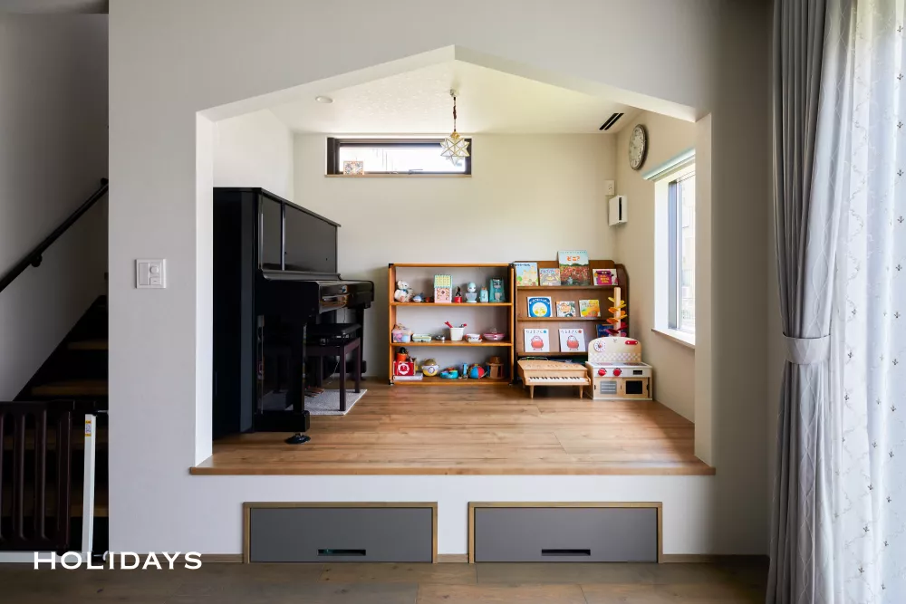 LDKに隣接したヌックの小上がり部分には、デッドスペースを有効活用した収納を造作。お子様のおもちゃなどをスッキリと片付けることができ、とても便利な空間に。ヌックの山型垂れ壁は、お子様の遊び場を“特別な秘密基地”のように演出しつつ、LDKとの空間を緩やかに仕切る。