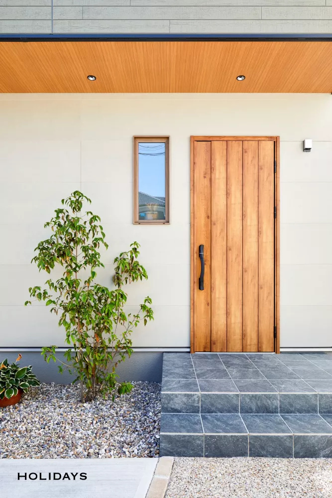 グレージュの外壁とグリーンの木目調外壁を組み合わせ、さらにミディアムブラウンをアクセントに取り入れた外観は、「現代風レトロ」のコンセプトにぴったりの仕上がりとなった。