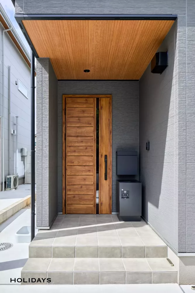 軒の出をしっかりと確保した玄関。宅配ボックス・ポストをドア横に設置し、雨に濡れることなく快適にお使いいただけるよう計画した。