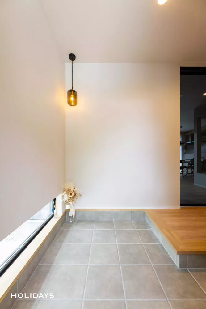 足元の窓から明るい太陽の光が差し込む広々とした玄関。玄関ドア正面にグレーガラスのペンダントライトを設え、リビングドアとの統一感を持たせている。