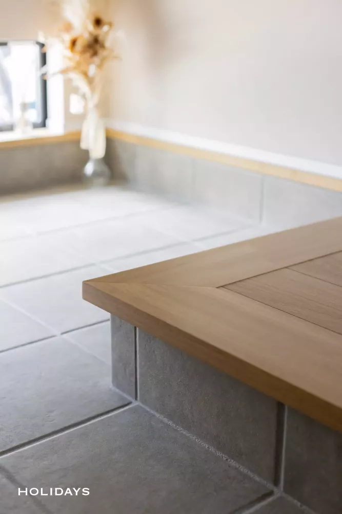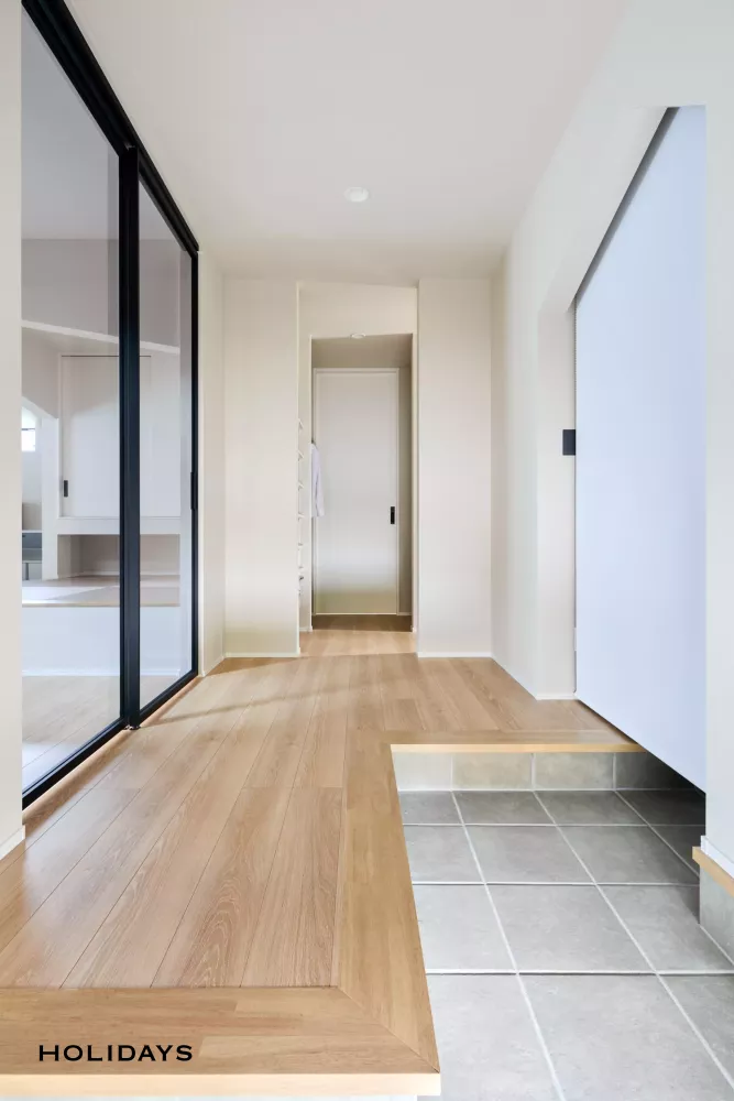 玄関は間口を広くとり、框部分もL型に仕上げることで土間から直接シューズインクロークへのアクセスも可能に。洗面台・脱衣室へ向かう部分の垂れ壁はあえてなくし抜け感を演出。その先のドアも天井まで高さのあるものとし、より開放的な印象に仕上げた。