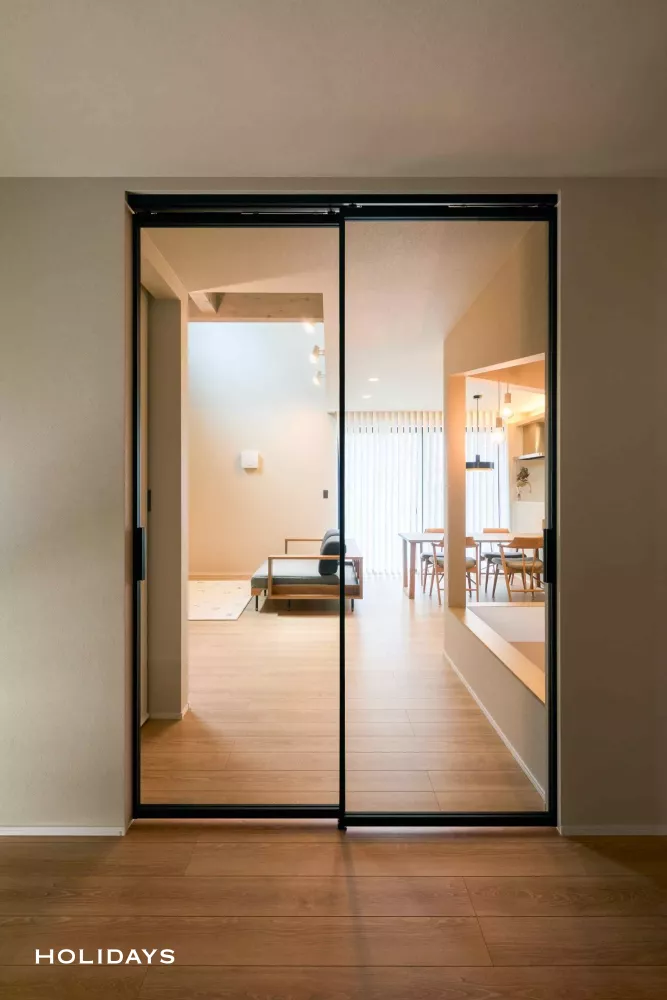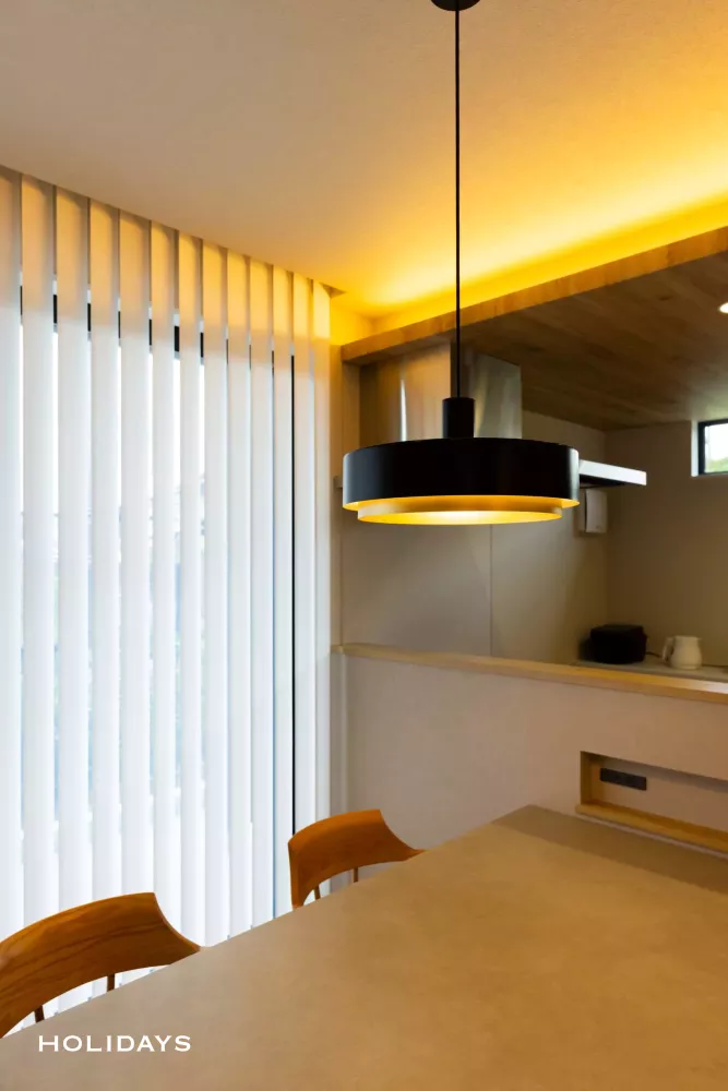 ガラスデザインのリビングドアを活かし、LDKの柔らかくあたたかい雰囲気が溢れるような照明計画にこだわった。