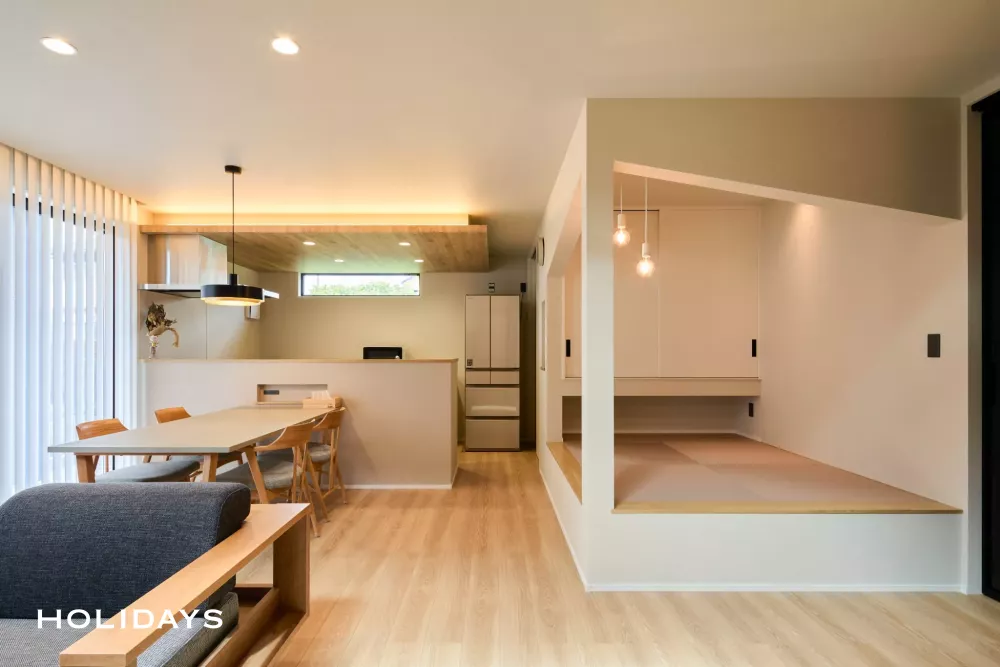 下がり天井に間接照明を造作した特別感のあるキッチンまわり。畳を用いた小上がりスペースはフロート収納を造作し、お子様のおもちゃなども十分に収納できるスペースを確保した。