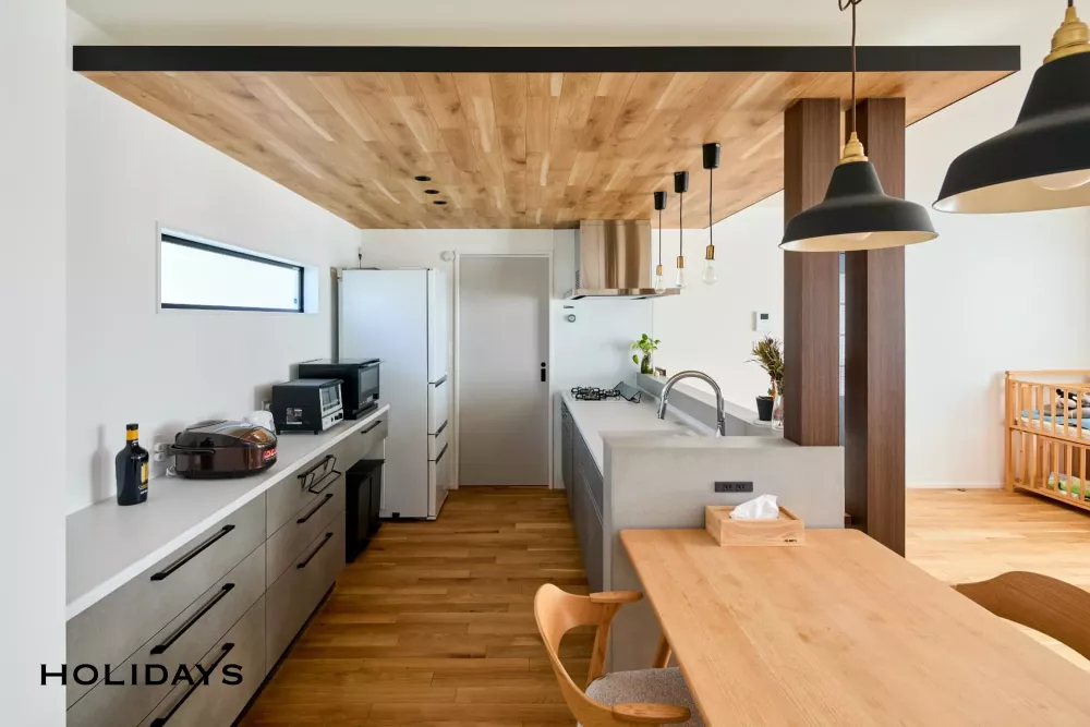 キッチンの腰壁には塗壁を採用。グレー塗壁の無骨さにアイアンの脚でかっこよさを演出している。また下がり天井に採用した木目クロスをよりリアルにみせるため、アゴにアイアン風の笠木材を使用した。