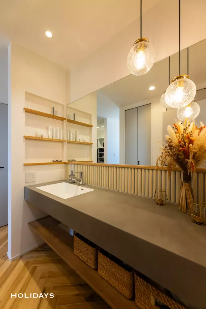 幅広ミラーで2人並んでも空間にゆとりを感じられる造作洗面台。向かって左側の壁に小物用ニッチを造ることで玄関側からの生活感を隠しつつ収納力も確保。立体的な曲面を持つボーダータイルは存在感がありながらも、上品さを感じられる。