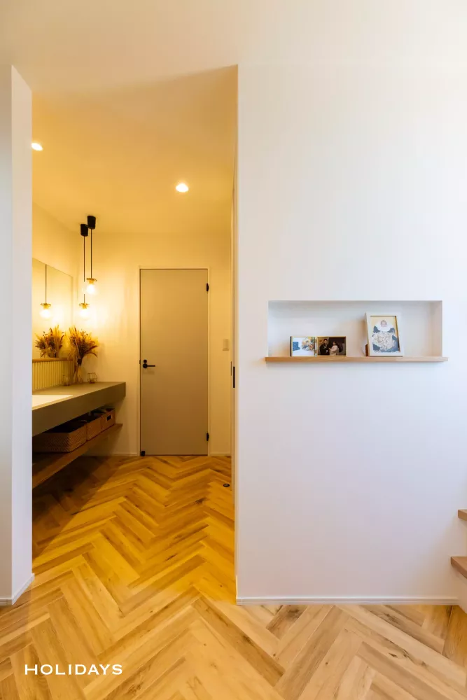 キッチン奥の扉は脱衣室に繋がっており、脱衣室からは玄関ホールに抜ける回遊性の高い間取りを叶えた。